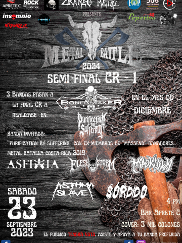 Procedemos ya con los cambios debido a la variante del Venue en las batallas en Costa Rica. Para la primer fecha donde participan AsfixiA CR, FLESH STORM, Mad Klown, Asthma slave y Sordido Grindcore , avanzando tres de éstos a la final, la fecha se traslada al 23 de Setiembre y el cierre estará ahora a cargo de PURIFICATION BY SUFFERING, banda integrada por ex-miembros de MASSEND, ganadores de ésta competencia en el 2019 y representantes por Costa Rica en Panamá en la final Centroamericana. Entrada 3 Mil colones. Asiste y apoya la escena.