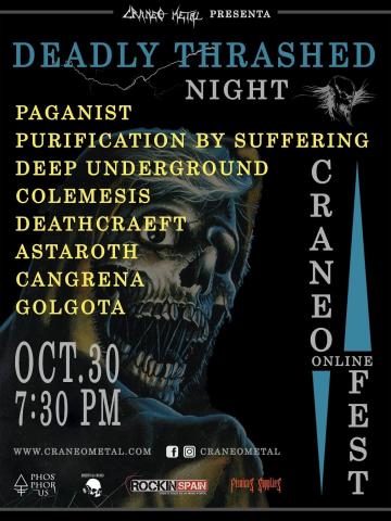 Posteriormente nos trasladamos al 30 de octubre donde el DEADLY THRASHED NIGHT traerá a 8 bandas, ASTAROTH, PAGANIST y COLEMESIS entre otras, de dichos géneros para arrancar un fin de semana que nos traerá actos de todo iberoamerica, Canadá y Europa en el CRANEO ONLINE FEST.