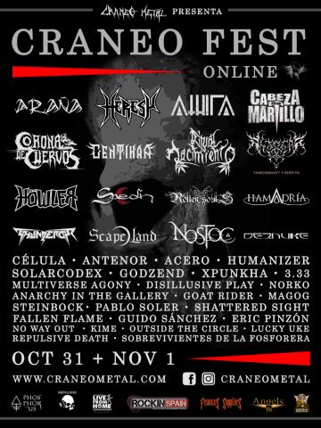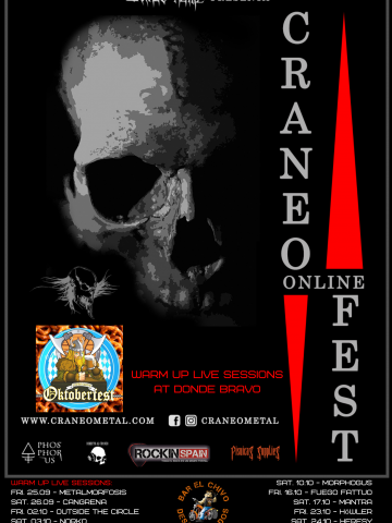 Con un total de 56 Presentaciones y 24 guitarristas, tenemos el agrado de presentar el cartel final del CRANEO ONLINE FEST. Con la excelente línea gráfica de Phosphorus Studios, Craneo Metal llevará a cabo el festival en línea que incia con 11 "Warm Up Parties", las cuales se llevan ya a cabo en tanto online como presencialmente donde otro de nuestros colaboradores, el Bar Restaurante DONDE BRAVO. Las mismas finalizan el día 30 de Octubre.