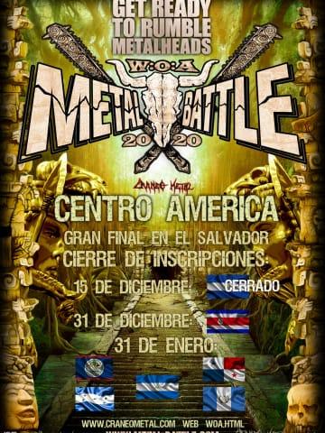 La producción de la Metal Batalla al W:O:A en El Salvador cierra oficialmente sus inscripciones con tres bandas inscritas, MOAN, DIENTE AMARGO y EL GRAN KOALA. La contienda se llevará a cabo en el mes de Enero y los detalles estarán pronto publicados para que apoyes a tu preferida en camino a la mecca del metal.