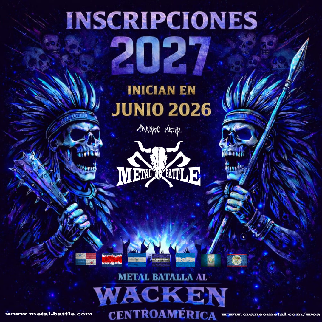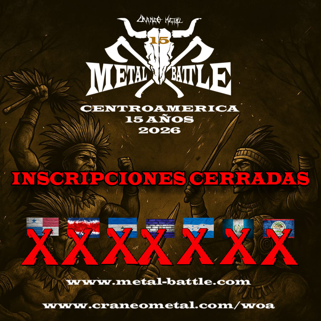 Craneo Metal confirma la participación de Centroamérica nuevamente en la Metal Batalla para el W:O:A 2026. Luego ya DIEZ exitosas participaciones con Metal Core, Death, Black Metal, Metal Tribal, HipHop-Metal, donde hemos llegado incluso a una SEXTA y una NOVENA posición entre las naciones que compiten en el festival.